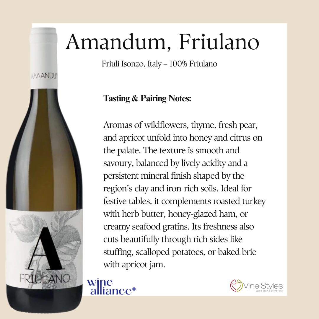 Aromas of wildflowers, thyme, fresh pear, and apricot unfold into honey and citrus on the palate. The texture is smooth and savoury, balanced by lively acidity and a persistent mineral finish shaped by the region’s clay and iron-rich soils. Ideal for festive tables, it complements roasted turkey with herb butter, honey-glazed ham, or creamy seafood gratins. Its freshness also cuts beautifully through rich sides like stuffing, scalloped potatoes, or baked brie with apricot jam.