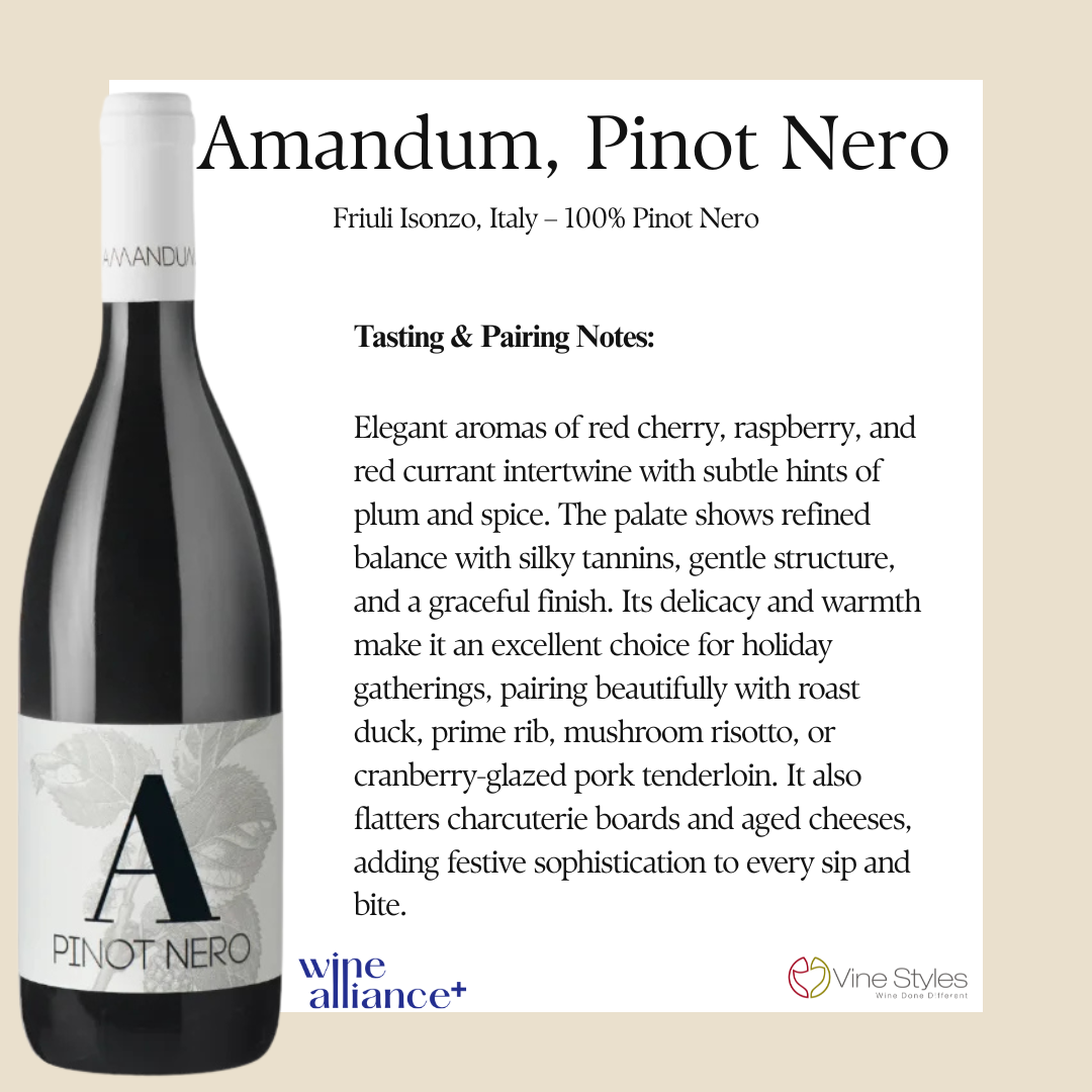 Elegant aromas of red cherry, raspberry, and red currant intertwine with subtle hints of plum and spice. The palate shows refined balance with silky tannins, gentle structure, and a graceful finish. Its delicacy and warmth make it an excellent choice for holiday gatherings, pairing beautifully with roast duck, prime rib, mushroom risotto, or cranberry-glazed pork tenderloin. It also flatters charcuterie boards and aged cheeses, adding festive sophistication to every sip and bite.