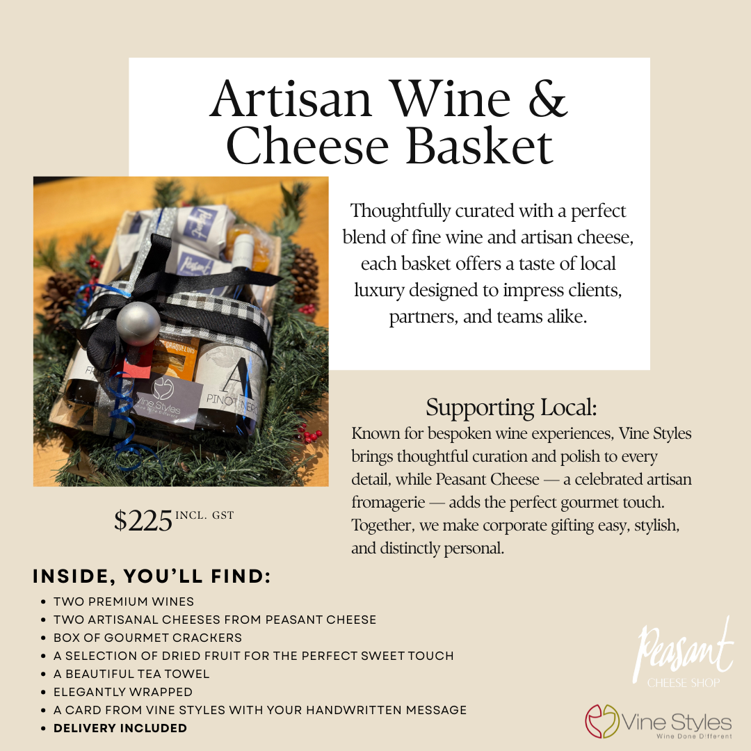Known for bespoken wine experiences, Vine Styles brings thoughtful curation and polish to every detail, while Peasant Cheese — a celebrated artisan fromagerie — adds the perfect gourmet touch. Together, we make corporate gifting easy, stylish, and distinctly personal.